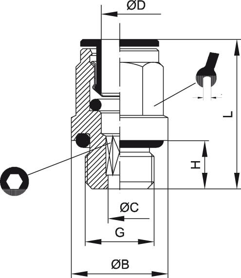Gerade Steck Einschraubverschraubungen, Lösbar, Technische Daten: Werkstoff: Gehäuse Messing, vernickelt, Dichtungen aus NBR silikonfrei, Spannzange aus Edelstahl AISI316, Druckring aus HOSTAFORM schwarz, Betriebsdruck: max. 16 bar bei 20° C, Medium: Druckluft, Temperaturbereich: -20° C bis +70° C