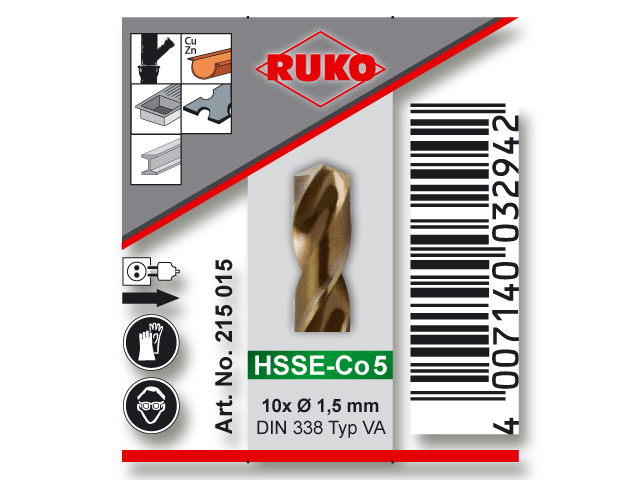 Ø 1,5 x 40 x 18 mm. Kräftiger rechtsschneidender Hochleistungsbohrer mit ausgeprägter Warmhärtebeständigkeit. Ideal zum Bohren von rost-, säure- und hitzebeständigem Stahl mit hoher Festigkeit. - Kräftiger rechtsschneidender Hochleistungsbohrer mit ausgeprägter Warmhärtebeständigkeit. Ideal zum Bohren von rost-, säure- und hitzebeständigem Stahl mit hoher Festigkeit. HSS Co 5:Hochleistungs-Schnellarbeitsstahl mit 5 % Cobaltanteil. Hohe Zähigkeit und Wärmebeständigkeit, für Bohrungen in schwer bearbeitbare Materialien mit einer Festigkeit von bis zu 1100 N/mm².
