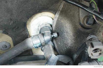 Kühlsystemdruck über Schrader-Steckverbinder prüfen.